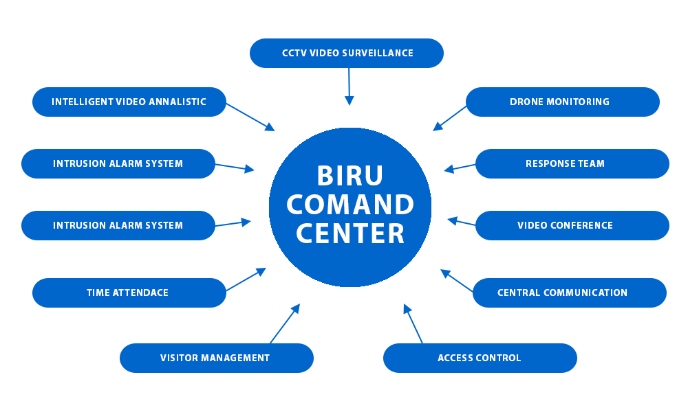 BIRU Command Center (BCC) adalah Sistem Keamanan Terpadu dan Terpantau 24 Jam 7 Hari, BIRU Memberikan Layanan dan Solusi Terbaru di Command Center untuk Memberikan Perintah, Koordinasi, Monitoring, dan Mitigasi Sekaligus